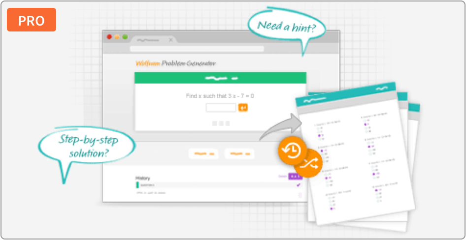 With Wolfram Problem Generator, each question is generated instantly, just for you. Pro subscribers get integrated step-by-step solutions and can create printable worksheets for study sessions and quizzes.