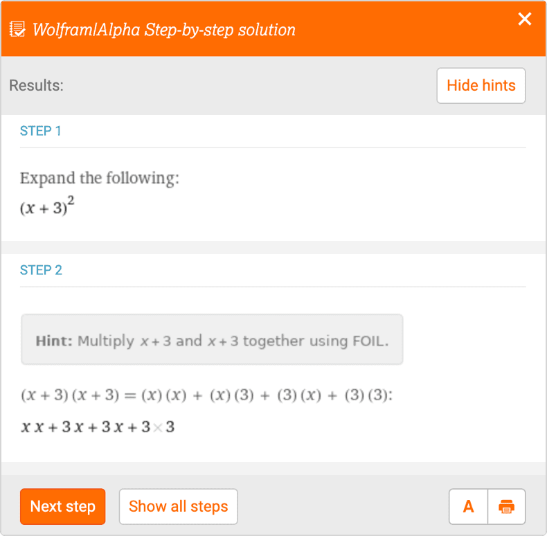 Gain more understanding of your homework with steps and hints guiding you from problems to answers! Wolfram|Alpha Pro step-by-step solutions not only give you the answers you're looking for, but also help you learn how to solve problems.